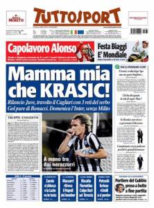 Sul quotidiano torinese Tuttosport si elogia la prova di super Milos Krasic. L’esterno serbo della Juventus è stato autore di una partita strepitosa ieri sera contro il Cagliari. La tripletta dell’ex calciatore del Cska Mosca si è rivelata decisiva nel 4 a 2 contro i sardi.