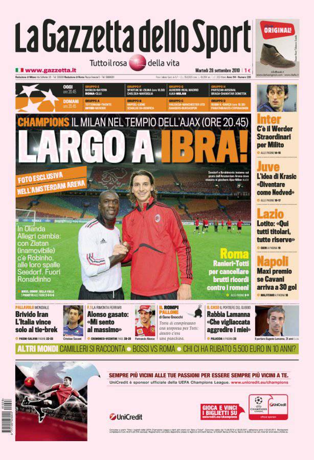 GAZZETTA DELLO SPOSRT: Stasera il Milan affronta l’Ajax. Una partita speciale non solo per Seedorf, ma anche per Ibrahimovic che guiderà l’attacco rossonero nello stadio che l’ha visto crescere.
