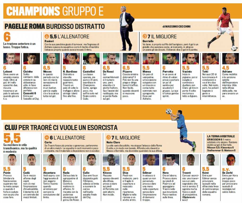 ROMA-CLUJ – La Roma di Ranieri vince anche in Champions League e raccoglie i primi tre punti contro i romeni del Cluj che non hanno certamente sfigurato all’Olimpico. Il migliore dei giallorossi è stato Marco Borriello autore di un gol fenomenale. Male Adriano, non bene Francesco Totti. Ecco i voti della Gazzetta dello Sport.