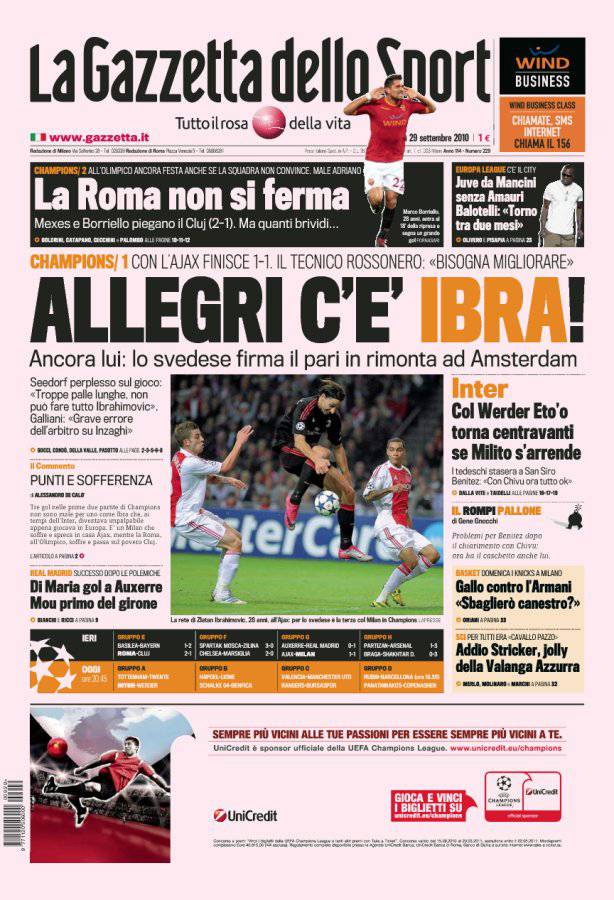 Sulla Gazzetta dello Sport si parla del pareggio del Milan in casa dell’Ajax nella seconda giornata del girone di Champions League. Dopo il vantaggio dei lancieri i rossoneri hanno pareggiato grazie al solito Zlatan Ibrahimovic. Il tecnico del Milan Allegri non è stato contento della prova dei rossoneri.
