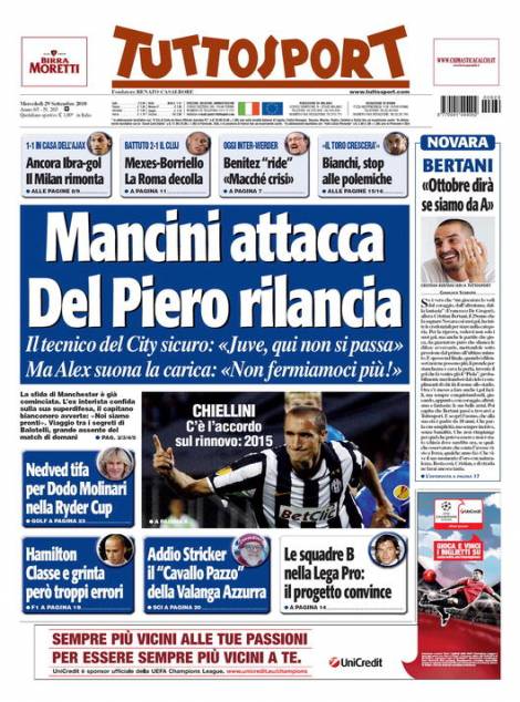 Su Tuttosport si parla del match di giovedì sera tra Juventus e Manchester City nella seconda giornata del girone di Europa League. Il manager italiano dei Citizens, Roberto Mancini, ha avvisato la formazione bianconera, mentre Del Piero ha suonato la carica.