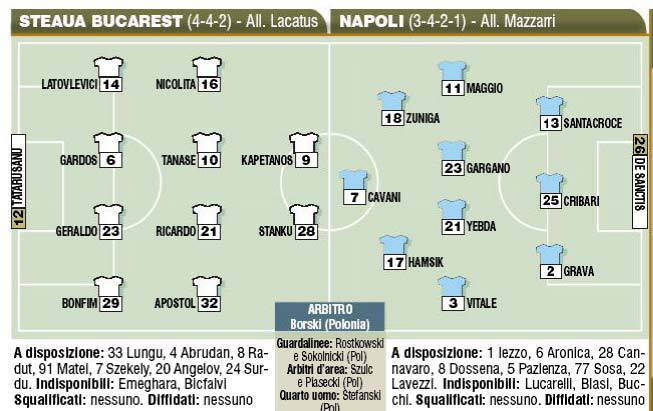 STEAUA BUCAREST NAPOLI PROBABILI FORMAZIONI – Il Napoli di Mazzarri affronta in terra romena la Steaua. Il tecnico Mazzarri punta su Cavani in attacco mentre a centrocampo è previsto un massiccio turnover. Ecco le probabili formazioni secondo il Corriere dello Sport.