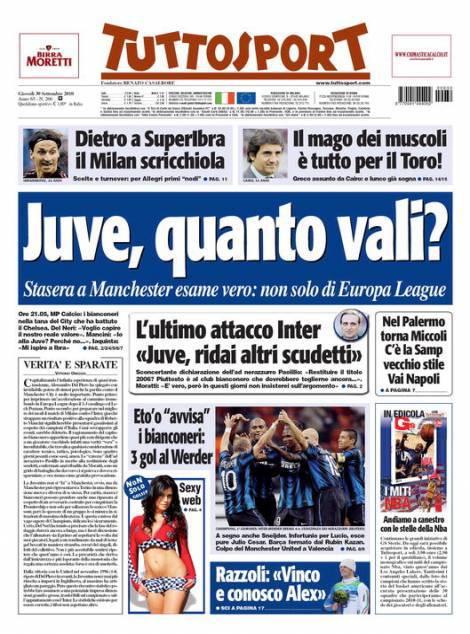 Sul quotidiano torinese Tuttosport si parla della sfida di questa sera in Europa League tra il Manchester City di Mancini e la Juventus di Delneri. Per i bianconeri un match difficile che anticipa un altro grande match in programma domenica sera contro l’Inter.