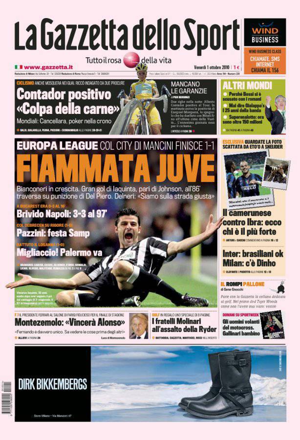Sulla Gazzetta dello Sport si parla del pareggio della Juventus sul campo del Manchester City nella seconda giornata di Europa League. Uno a uno al termine dei novanta minuti con le reti di Iaquinta e Johnson. Buona la prova dei bianconeri.