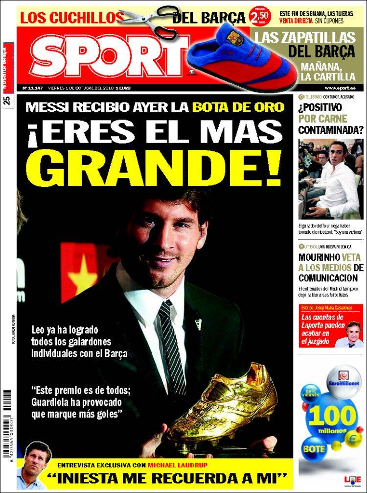 Anche l’altro quotidiano catalano Sport parla della Scarpa d’Oro consegnata a Lionel Messi, fuoriclasse argentino del Barcellona. Dopo il Pallone d’Oro vinto nella scorsa stagione un altro riconoscimento importante per la stella argentina.