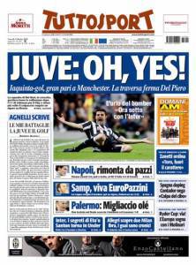 Sul quotidiano torinese Tuttosport si parla ovviamente del pareggio della Juventus sul campo del Manchester City con i gol di Iaquinta e Johnson. Una buona prova quella dei bianconeri condita con la traversa di Del Piero nei minuti finali.