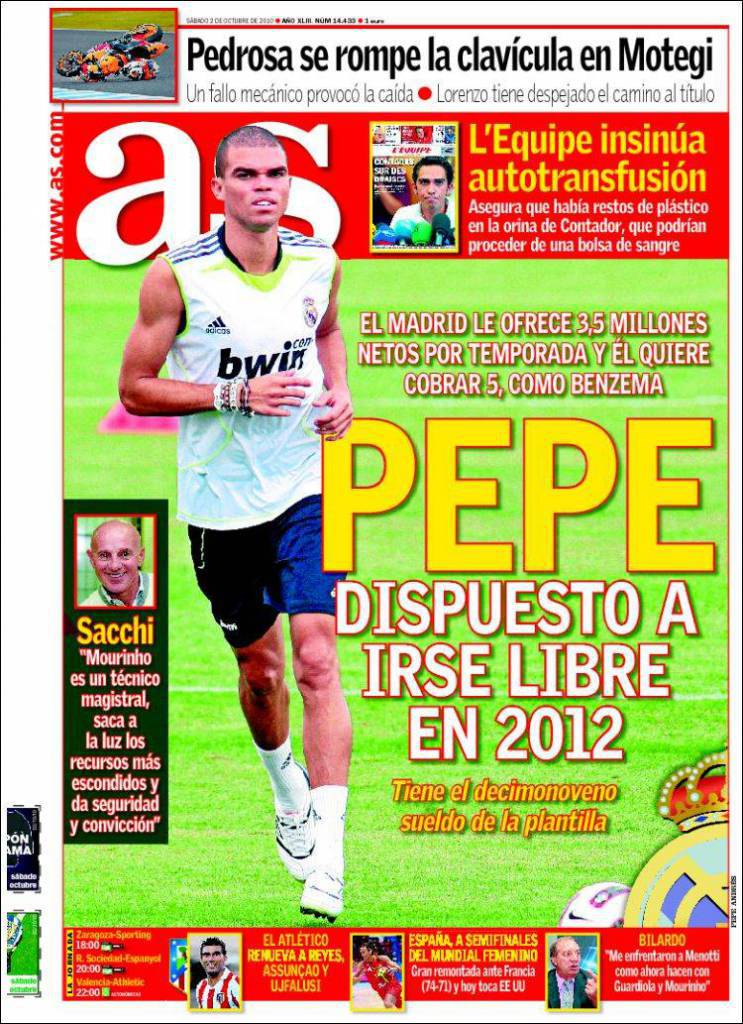 Anche il quotidiano As parla del calciomercato del Real Madrid. Questa volta il protagonista è il difensore portoghese Pepe che ha il contratto in scadenza nel 2012. I madrileni offrono circa 3,5 milioni di euro, il portoghese ne chiede 5, come l’ingaggio percepito da Benzema.