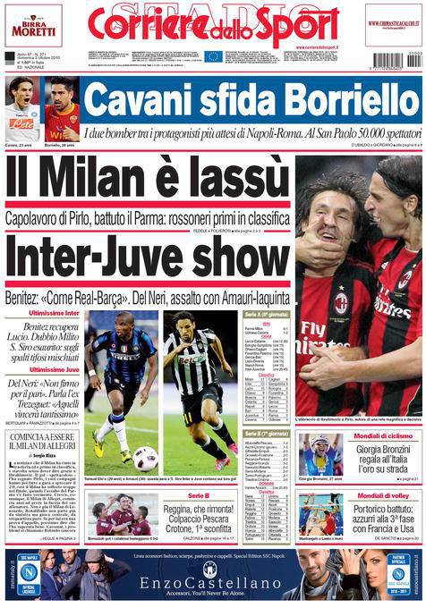 CORRIERE DELLO SPORT RASSEGNA STAMPA – Come riporta nella prima pagina stamane il Corriere dello Sport, il Milan è primo avendo vinto ieri sera 1 a 0 sul campo del Parma grazie ad un gol di Andrea Pirlo e si è portato al primo posto nella classifica di Serie A. Stasera invece ore 20,45 andrà di scena Inter-Juventus allo stadio San Siro, partita molto importante per l’evolversi di questa stagione.