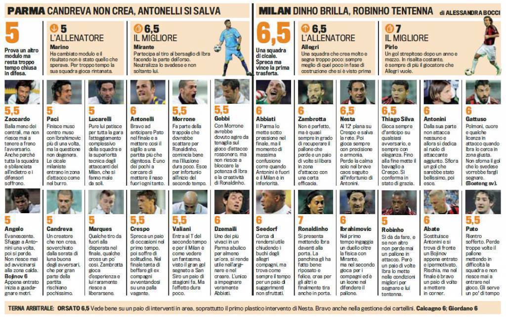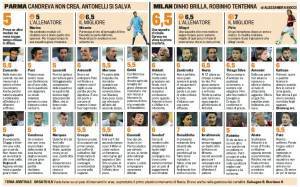 VOTI E PAGELLE GAZZETTA PARMA MILAN – La Gazzetta dello Sport ha stilato le pagelle della partita vittoriosa del Milan di ieri sera contro il Parma. Una vittoria sofferta per 1 a 0 grazie al gol di Andrea Pirlo molto importante visto che i rossoneri attualmente sono primi in classifica ed hanno sorpassato Lazio ed Inter che quest’oggi però giocheranno rispettivamente contro Brescia e Juventus.