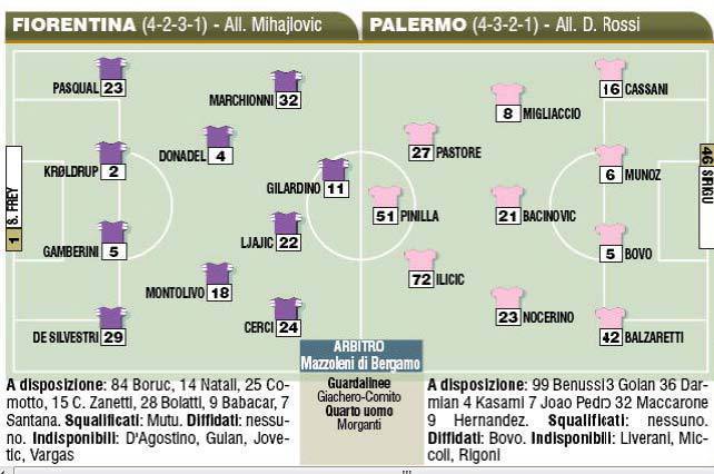 FANTACALCIO SERIE A FIORENTINA PALERMO FORMAZIONI – Alle ore 15,00 allo stadio Artemio Franchi di Firenze si giocherà una partita che si preannuncia molto interessante e spettacolare, infatti si sfideranno Fiorentina-Palermo, due squadre che giocano a viso aperto e sempre alla ricerca della vittoria. Ecco a voi le probabili formazioni della partita prese dal Corriere dello Sport.