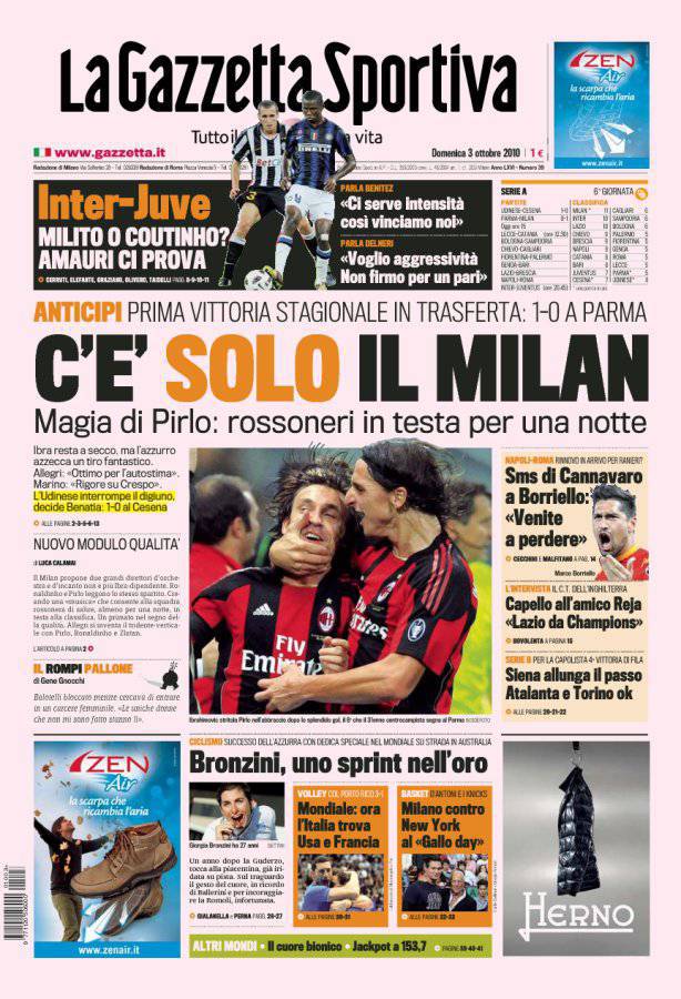 GAZZETTA DELLO SPORT RASSEGNA STAMPA – C’è solo il Milan. Almeno da quanto titola la Gazzetta dello Sport, anzi anche guardando la classifica in questo momento c’è solo il Milan in vetta, infatti dopo la vittoria sofferta contro il Parma per 1 a 0 grazie ad un grande gol del centrocampista Andrea Pirlo i rossoneri sono balzati al primo posto andando a +1 sull’Inter che stasera sfiderà la Juventus in casa e sulla Lazio che oggi alle 15,00 sfiderà il Brescia allo stadio Olimpico.