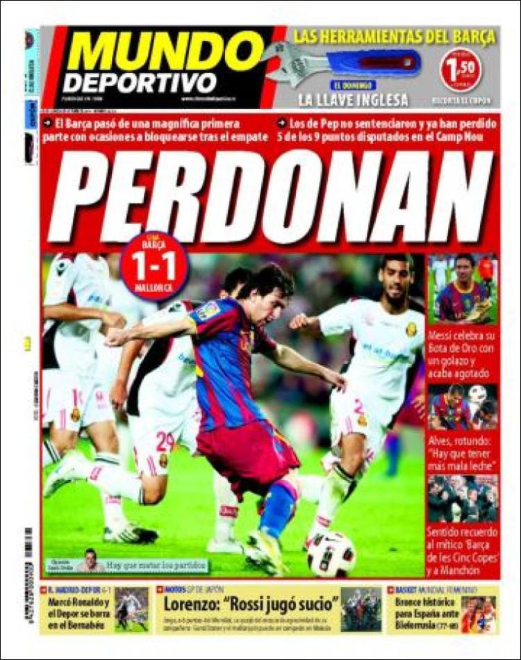 Sul quotidiano catalano El Mundo Deportivo si parla del clamoroso pareggio interno del Barcellona che impatta uno a uno sul campo del Mallorca. Nei blaugrana in gol il solito Lionel Messi tornato in campo dopo il brutto intervento subito da Ujfalusi.