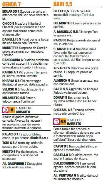 Fantacalcio Serie A Genoa-Bari – Con un gol di Luca Toni nel finale, il Genoa ha ottenuto la sua prima vittoria casalinga in questa stagione di Serie A. Ecco le pagelle della ‘Gazzetta dello Sport’ relative alla partita: grande prestazione di Domenico Criscisto.