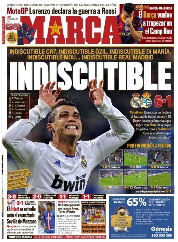 Il quotidiano spagnolo Marca parla del sei a uno del Real Madrid contro il Deportivo La Coruna con la doppietta di Cristiano Ronaldo, i gol di Ozil, Di Maria, Higuain e l’autorete di Ze Castro. Inutile il gol di Juan Rodriguez per il Deportivo.