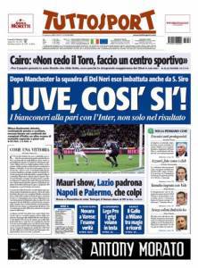 Sul quotidiano torinese Tuttosport viene elogiata la prova della Juventus che riesce a uscire indenne anche da San Siro nel big match della sesta giornata contro l’Inter di Benitez. Delneri a fine gara si è detto soddisfatto del punto guadagnato grazie alla ritrovata compattezza di squadra.