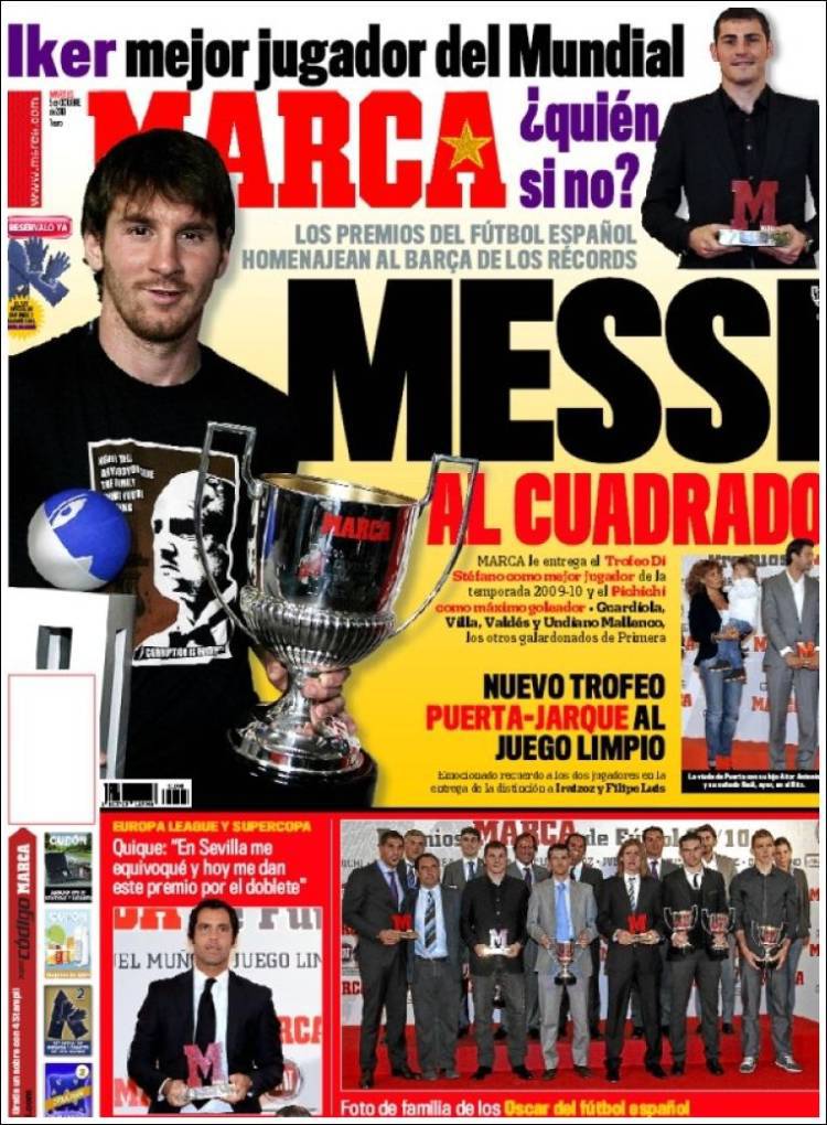MESSI MARCA PREMIO – Lionel Messi vince un altro trofeo personale. Il quotidiano spagnolo Marca ha infatti premiato l’attaccante argentino del Barcellona con il trofeo dedicato a Di Stefano, storico attaccante del Real Madrid. Premiati anche altri giocatori del Barcellona e l’allenatore dell’Atletico Madrid Quique Sanchez Flores.
