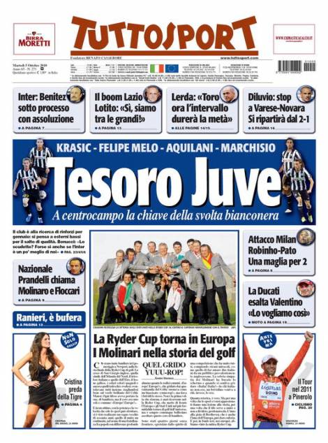 CENTROCAMPO JUVENTUS DELNERI TUTTOSPORT – In casa Juventus il tecnico Delneri sembra aver trovato la formula giusta soprattutto per il reparto di centrocampo. Infatti nel match contro l’Inter l’ex tecnico della Sampdoria ha schierato la linea a quattro formata da Krasic-Felipe Melo-Aquilani-Marchisio.