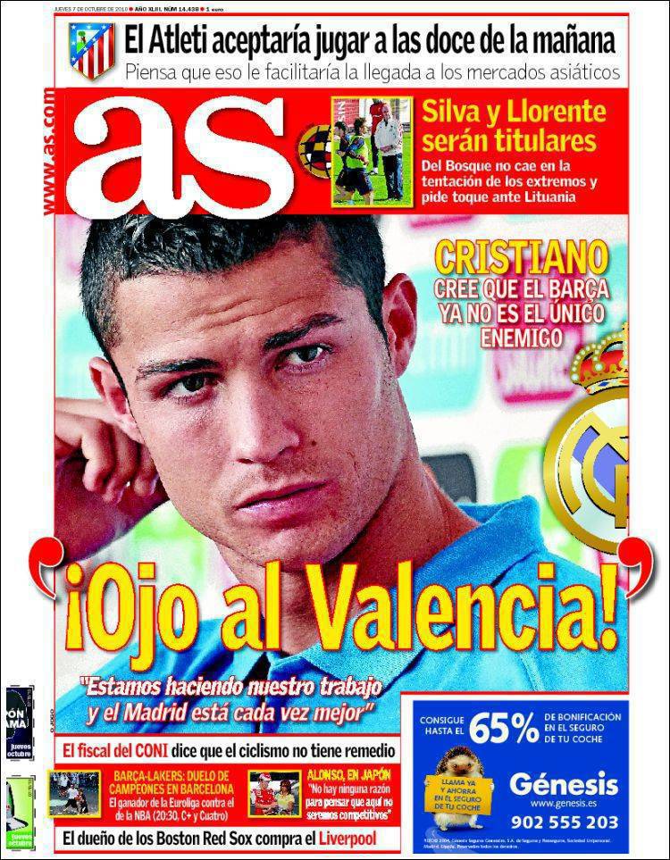Sull’altro quotidiano madrileno As il fenomeno portoghese del Real Madrid Cristiano Ronaldo ha dichiarato che per la lotta al titolo bisogna fare attenzione all’attuale capolista della Liga, ovvero il Valencia, oltre al solito Barcellona.