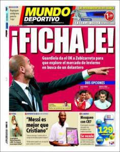 Il quotidiano catalano El Mundo Deportivo parla del calciomercato del Barcellona e in particolare della richiesta di Guardiola alla società catalana di acquistare un centravanti nel prossimo mercato invernale. I nomi sono quelli di Suarez dell’Ajax e di Tevez del Manchester City.