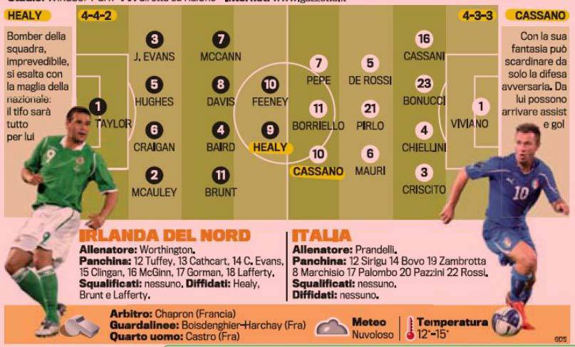 IRLANDA DEL NORD ITALIA FORMAZIONI – Questa sera a Belfast la Nazionale italiana guidata da Cesare Prandelli affronterà l’Irlanda del Nord nel match valido per le qualificazioni ai prossimi Europei. L’ex tecnico della Fiorentina si affiderà a Viviano in porta, Mauri a centrocampo e Cassano in attacco. Ecco le formazioni secondo la Gazzetta dello Sport.