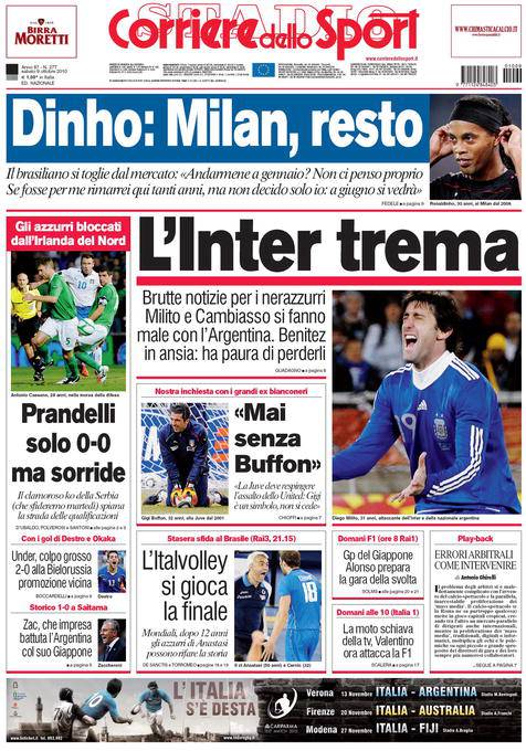 Il Corriere dello Sport parla della situazione infortunati in casa Inter. Ieri infatti nell’amichevole tra Giappone e Argentina i due nerazzurri Diego Milito ed Esteban Cambiasso hanno portato dei problemi muscolari. Non si conoscono ancora i tempi di recupero.