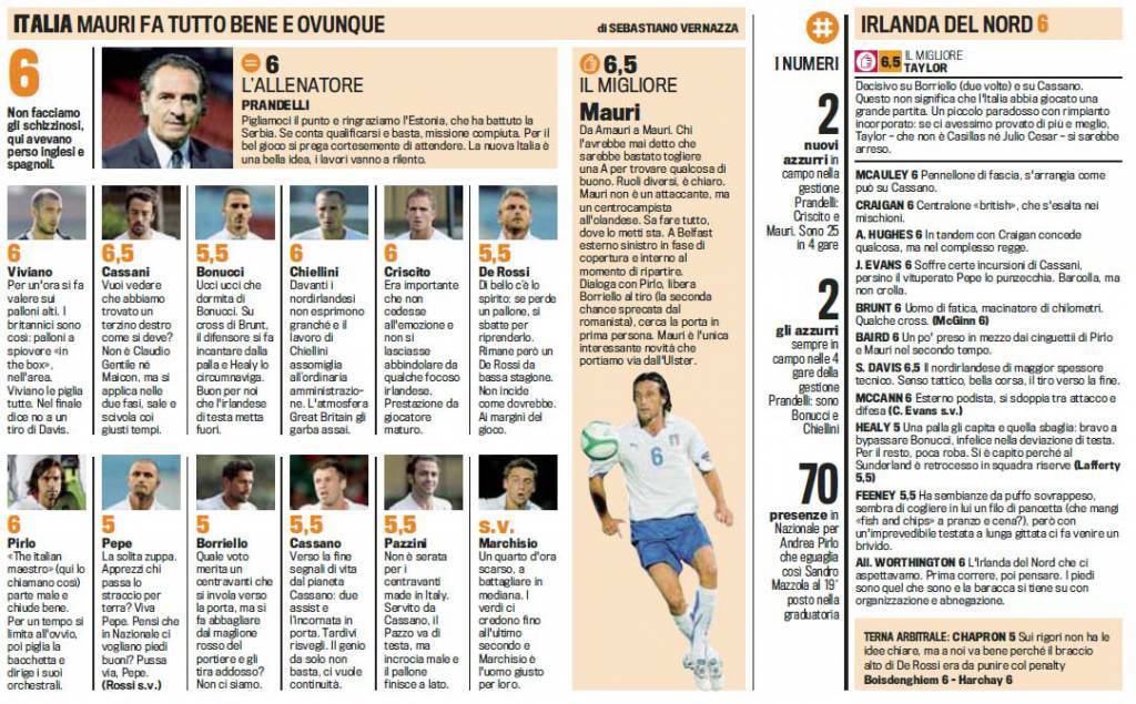 IRLANDA ITALIA QUALIFICAZIONI EURO 2012 PAGELLE – Ieri si è giocata la gara di qualificazione per l’Europeo del 2012 della nostra nazionale e l’Italia non è andata oltre il pareggio per 0 a 0 contro l’Irlanda fuori casa. La Gazzetta dello Sport ha stipulato le pagelle riguardanti la partita degli azzurri che comunque mantengono il primato nel girone, il migliore dei nostri è stato Stefano Mauri.