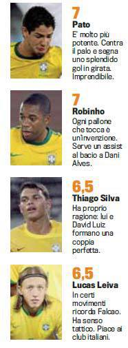 PAGELLE BRASILE UCRAINA PATO ROBINHO LEIVA – Altra vittoria del Brasile di Mano Menezes. Nell’amichevole contro l’Ucraina, brillano i milanisti Pato, Thiago Silva e Robinho. Bene anche Lucas Leiva che a gennaio potrebbe diventare un giocatore dell’Inter. Ecco le pagelle della Gazzetta dello Sport.