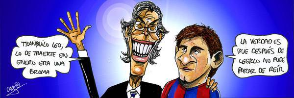 Per esorcizzare la paura di perdere l’idolo indiscusso dei tifosi o forse solo per schernire, sicuri del suo futuro, i “rivali di mercato” nerazzurri, l’ambiente blaugrana si è scatenato anche in alcune vignette satiriche. Eccone una, dal blog ‘Caye Cosas’…