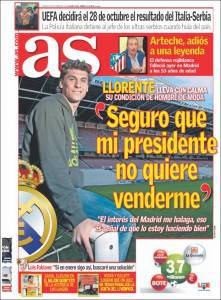 Sull’altro quotidiano spagnolo As intervista esclusiva al bomber della Spagna e dell’Atletico Bilbao Llorente che ha parlato dell’interessamento del Real Madrid dichiarando che il presidente dell’Atletico difficilmente lo lascerà partire a giugno.