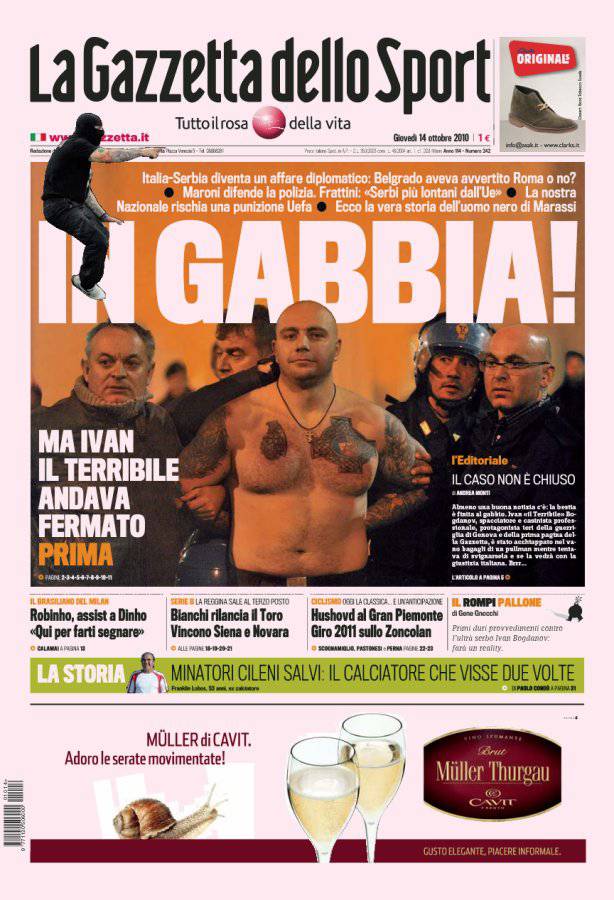 GAZZETTA RASSEGNA – La Gazzetta dello Sport parla dell’arresto di Ivan il Terribile, capo banda serbo che due giorni fa è stato uno dei protagonisti principali dei disordini prima e dopo il match Italia-Serbia sospeso per le interperanze dei tifosi serbi.