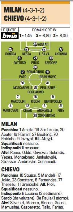 FANTACALCIO MILAN CHIEVO FORMAZIONI – Sabato pomeriggio il Milan di Allegri ospiterà il Chievo di Pioli. Il tecnico rossonero, come riporta la Gazzetta dello Sport, sembra orientato a confermare il 4-3-1-2 con Ronaldinho dietro Ibrahimovic e Pato. Nella formazione clivense Moscardelli dovrebbe affiancare Pellissier.