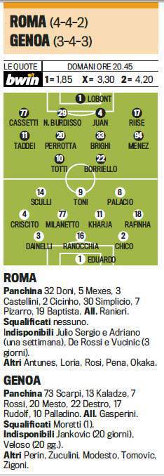 Fantacalcio Serie A formazioni Roma-Genoa – Ecco, secondo la ‘Gazzetta dello Sport’, le probabili formazioni di Roma e Genoa che sabato sera si affronteranno per la settima giornata di Serie A. Tra i giallorossi, spiccano le assenze di De Rossi e Vucinic, mentre per i rossoblù, attenzione alla voglia di farsi rimpiangere da parte del bomber, Luca Toni.