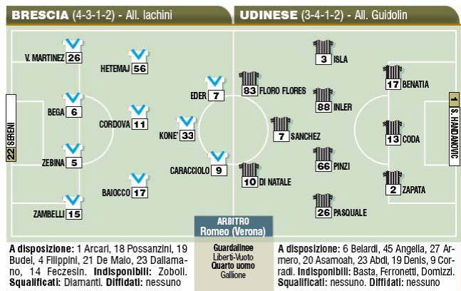 SERIE A – Nel match valido per la settima giornata di Serie A, il Brescia ospita in casa l’Udinese di Guidolin. Diamanti squalificato, prenderà il suo posto Konè tra le file del Brescia. Di seguito gli schieramenti delle formazioni secondo il Corriere dello Sport.