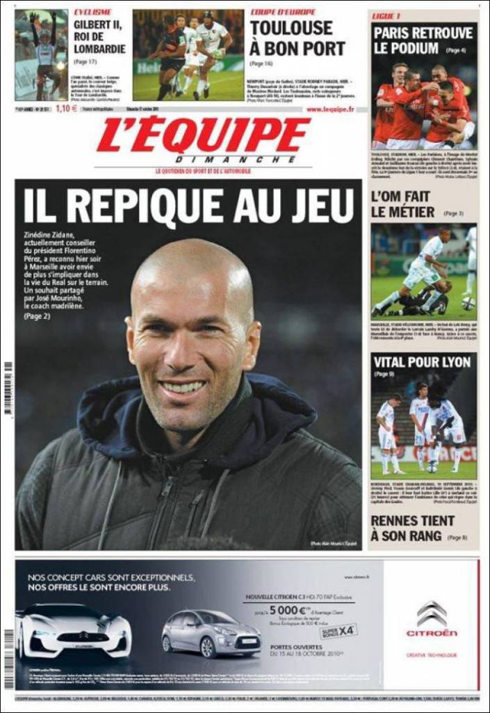 L’EQUIPE RASSEGNA STAMPA ESTERA FRANCIA – Zinedine Zidane ha parlato tra le colonne del quotidiano francese L’Equipe dichiarando sul fatto che è tornato a collaborare con il Real Madrid, si occuperà dei rapporti tra la prima squadra e il presidente Florentino Perez, come da lui stesso dichiarato: “Mi piace perché volevo rientrare un po’ di più in quella che è la struttura del club” , ha aggiunto Zidane, da poco più di un anno consigliere del numero uno del Real Madrid. 2Dall’inizio della stagione sto più con lui (Mourinho, ndr) che con il presidente… Collaborerò con Josè” .