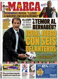 MARCA ALLEGRI MILAN REAL MADRID – Sul quotidiano spagnolo Marca intervista esclusiva al tecnico del Milan Massimiliano Allegri che in maniera spavalda rivela di non avere nessun timore del Real Madrid e del Bernabeu e giocherà comunque con sei giocatori d’attacco.