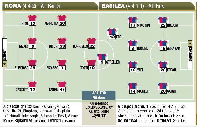 CHAMPIONS LEAGUE ROMA BASILEA – Anche la Roma di Claudio Ranieri è impegnata nella terza partita di Champions League. Gli avversari sono gli svizzeri del Basilea. Il tecnico romano non potrà schierare De Rossi, Vucinic e Menez, neanche convocati, ma spera nella grande vena di Totti e Borriello. Ecco le probabili formazioni del Corriere dello Sport.