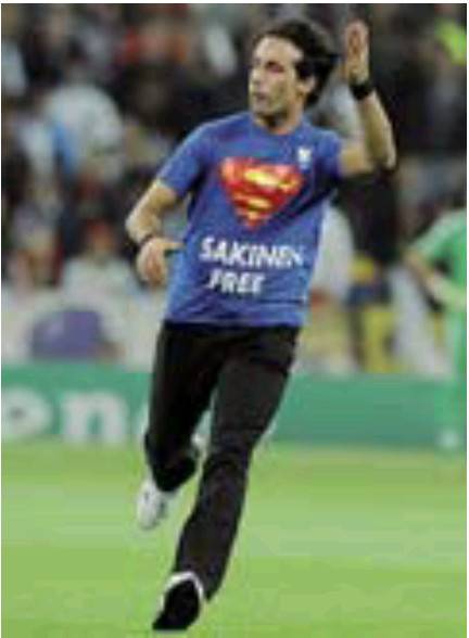 CHAMPIONS LEAGUE REAL MADRID MILAN CASSANO FOTO – E chi lo ferma Mario Ferri, alias “il Falco”? Il famoso invasore pacifico tifoso di Cassano ha colpito anche al Bernabeu al 5′ minuto di gioco di Real Madrid-Milan. Solita maglietta di Superman questa volta a favore della donna iraniana Sakineh condannata a morta in Iran. Ecco la foto del 23enne agente di commercio di Montesilvano che ha a carico un Daspo fino al 2018.