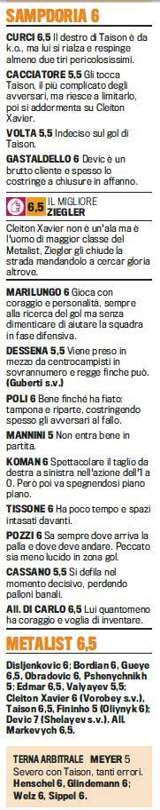 GAZZETTA METALIST SAMPDORIA PAGELLE – La Sampdoria di Di Carlo esce sconfitta dalla trasferta ucraina contro il Metalist. Il migliore in campo è lo svizzero Ziegler mentre in ombra il campione barese Antonio Cassano. Ecco le pagelle della Gazzetta dello Sport.