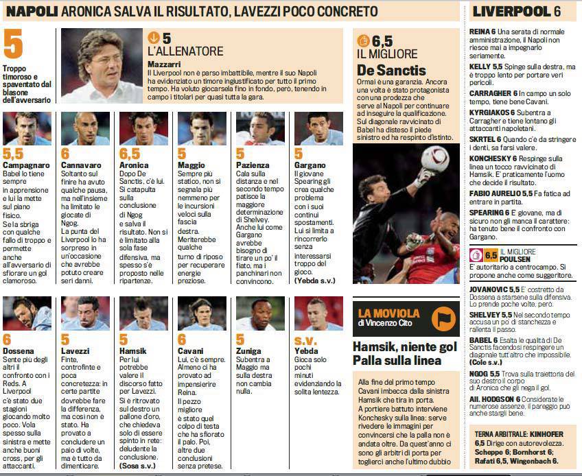 EUROPA LEAGUE GAZZETTA NAPOLI LIVERPOOL MOVIOLA – Napoli e Liverpool hanno dato vita a un match senza grandi emozioni. Per la Gazzetta dello Sport i due migliori in campo sono stati De Sanctis per il Napoli e l’ex juventino Poulsen per il Liverpool. Ecco le pagelle.