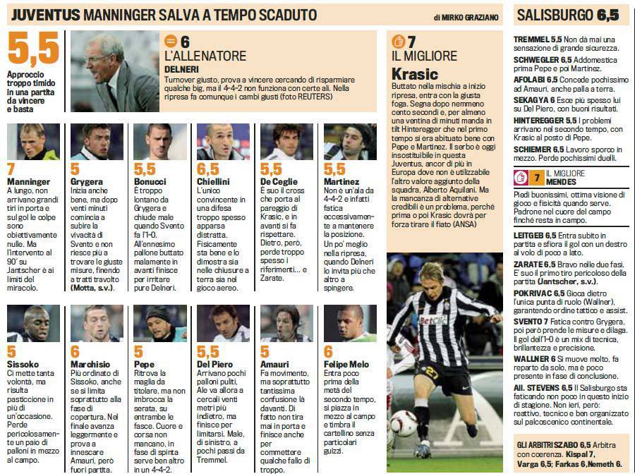 GAZZETTA JUVENTUS SALISBURGO PAGELLE – Come sempre Milos Krasic è l’arma in più della Juventus. Il serbo ancora una volta è il migliore in campo dei bianconeri. Grazie al suo ingresso la Juventus ha pareggiato proprio con il gol del serbo. Male Amauri e Pepe. Ecco le pagelle della Gazzetta dello Sport.