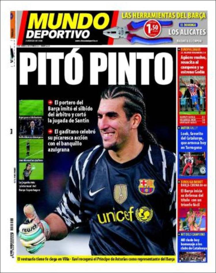 MUNDO DEPORTIVO RASSEGNA – Il Mundo Deportivo mette in prima pagina la gag del secondo portiere del Barcellona Pinto che durante il match contro il Copenhagen si è messo a fischiare come un arbitro provocando le risate dell’intero staff tecnico dei blaugrana.