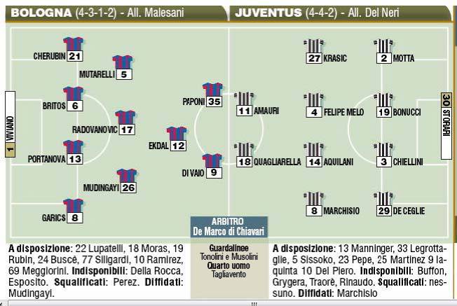 SERIE A BOLOGNA JUVENTUS PROBABILI FORMAZIONI – La Juventus vuole dare conferma dei risultati ottenuti nelle ultime partite e vuole ricominciare a risalire in classifica, oggi a Bologna si cercherà di fare assolutamente i 3 punti. Ecco a voi le probabili formazioni della partita che si giocherà alle ore 15,00 allo stadio Dall’Ara, prese dal Corriere dello Sport.