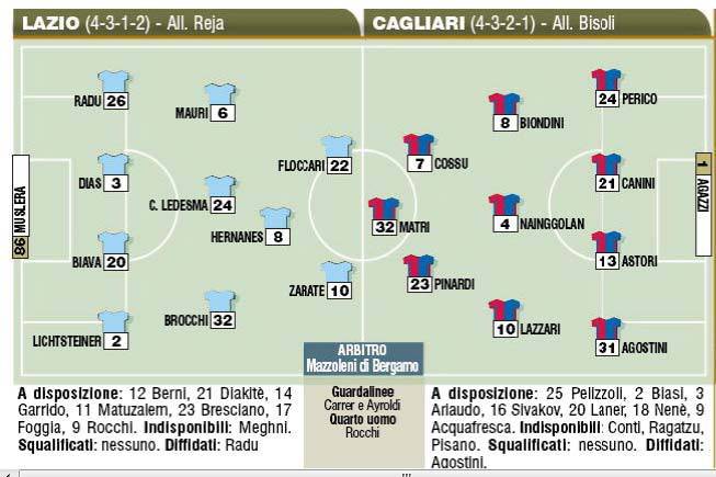 FANTACALCIO SERIE A – La capolista Lazio è in scena quest’oggi allo Stadio Olimpico della capitale contro il Cagliari di Bisoli. Reja opta per un 4-3-1-2 con Floccari e Zarate in avanti ed Hernanes a supporto dei due attaccanti in posizione di trequartista. Cagliari in campo con il modulo ad albero di Natale, Matri unica punta. Di seguito gli schieramenti di entrambe le formazioni.
