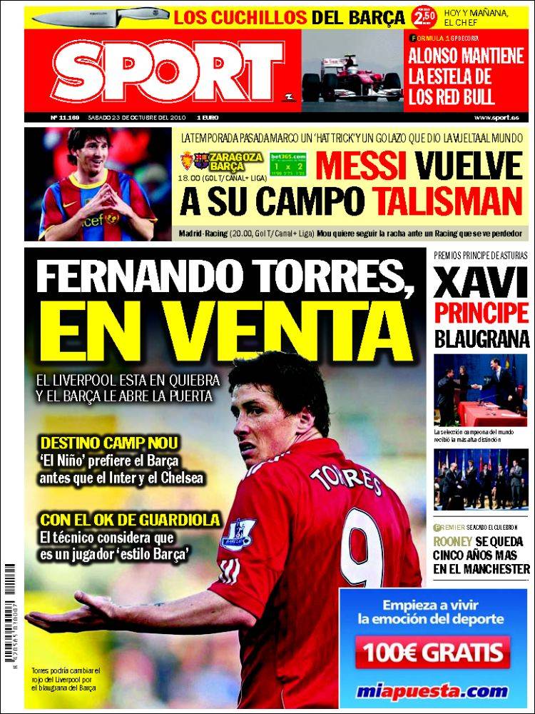 RASSEGNA STAMPA ESTERA SPORT SPAGNA – Secondo la prima pagina del quotidiano spagnolo Sport, l’attaccante ex Atletico Madrid Fernando Torres è stato messo in vendita dal Liverpool. Il giocatore è stufo della situazione che sta vivendo ai Reds che sono addirittura in zona retrocessione e vuole vincere qualcosa di importante. Su di lui ci sono molte squadre tra cui: Barça, Inter e Chelsea.