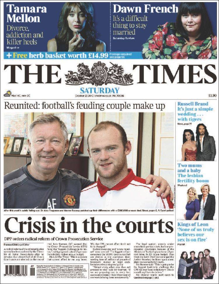 RASSEGNA STAMPA ESTERA THE TIMES INGHILTERRA – Tra Sir Alex Ferguson e Wayne Rooney c’è una crisi, dall’esterno non riusciamo a capire di preciso quanto è grande questa crisi poichè negli ultimi giorni l’attaccante inglese aveva dichiarato di voler andarsene dal Manchester ma sempre nelle ultime ore sembra che c’è stato un colloquio e si è trovato addirittura un accordo per il prolungamento di contratto.