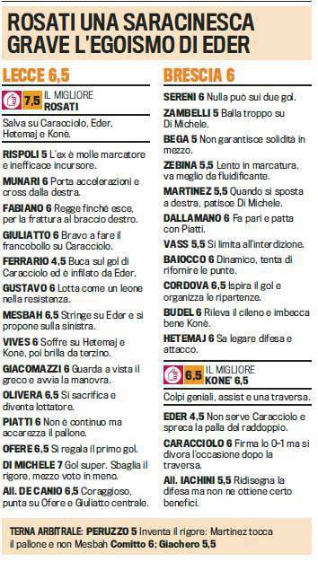 Fantacalcio Serie A, Lecce, Brescia – Il Lecce riesce a ribaltare il risultato e a vincere la partita contro il Brescia. I migliori in campo sono stati il portiere Rosati, e l’attaccante Di Michele, autore del gol vittoria. Nel Brescia una buona prestazione è stata offerta da Cordova e Kone. Malissimo Eder e Ferrario entrambi da 4,5.