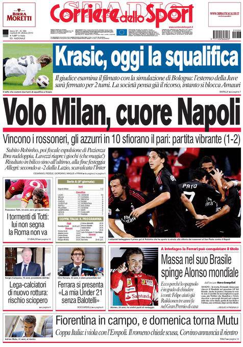 RASSEGNA MILAN NAPOLI – Anche il Corriere dello Sport parla del match vinto dal Milan sul campo del Napolo con i gol di Robinho e Ibrahimovic. Ma i partenopei nonostante l’inferiorità numerica hanno saputo reagire segnando con Lavezzi e sfiorando il pari in più di un’occasione.