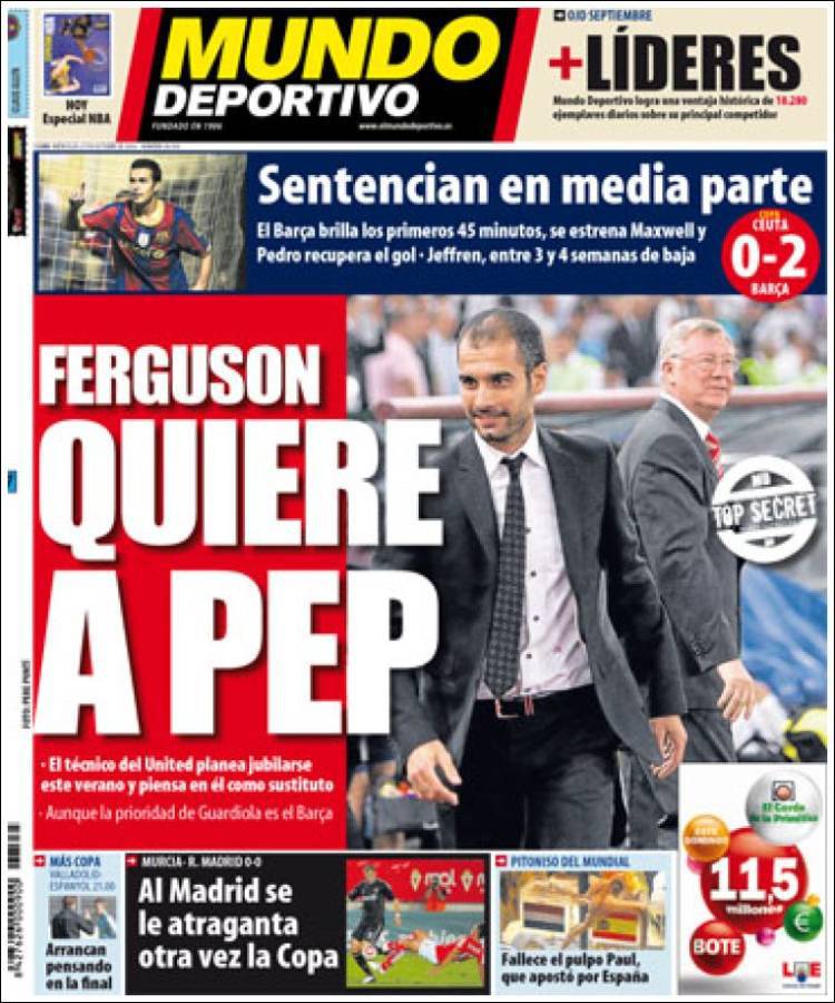 MUNDO DEPORTIVO RASSEGNA – Il quotidiano catalano El Mundo Deportivo rivela che il manager del Manchester United Sir Alex Ferguson starebbe pensando a Pep Guardiola come possibile sostituto qualora decidesse di andare in pensione. Tra i papabili anche lo Special One Josè Mourinho.