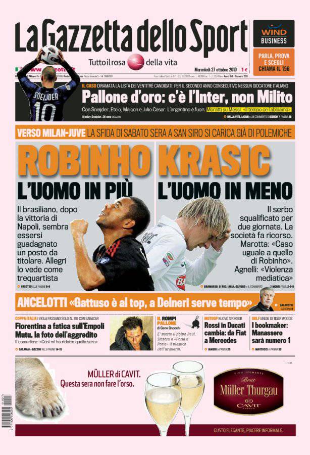 RASSEGNA GAZZETTA – Sulla Gazzetta dello Sport si parla del big match di sabato sera tra Milan e Juventus con i rossoneri che possono contare su un Robinho straripante mentre i bianconeri dovranno rinunciare a Krasic squalificato per due giornate dopo la simulazione contro il Bologna.
