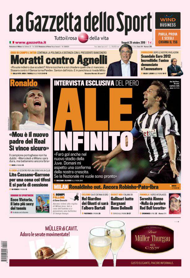RASSEGNA GAZZETTA – Sulla Gazzetta dello Sport intervista esclusiva ad Alessandro Del Piero, capitano della Juventus, che ha promesso ai tifosi bianconeri di voler segnare anche nel nuovo stadio della Juventus. Del Piero è a quota 178 reti in Serie A con la maglia bianconera, eguagliando il record di Boniperti.